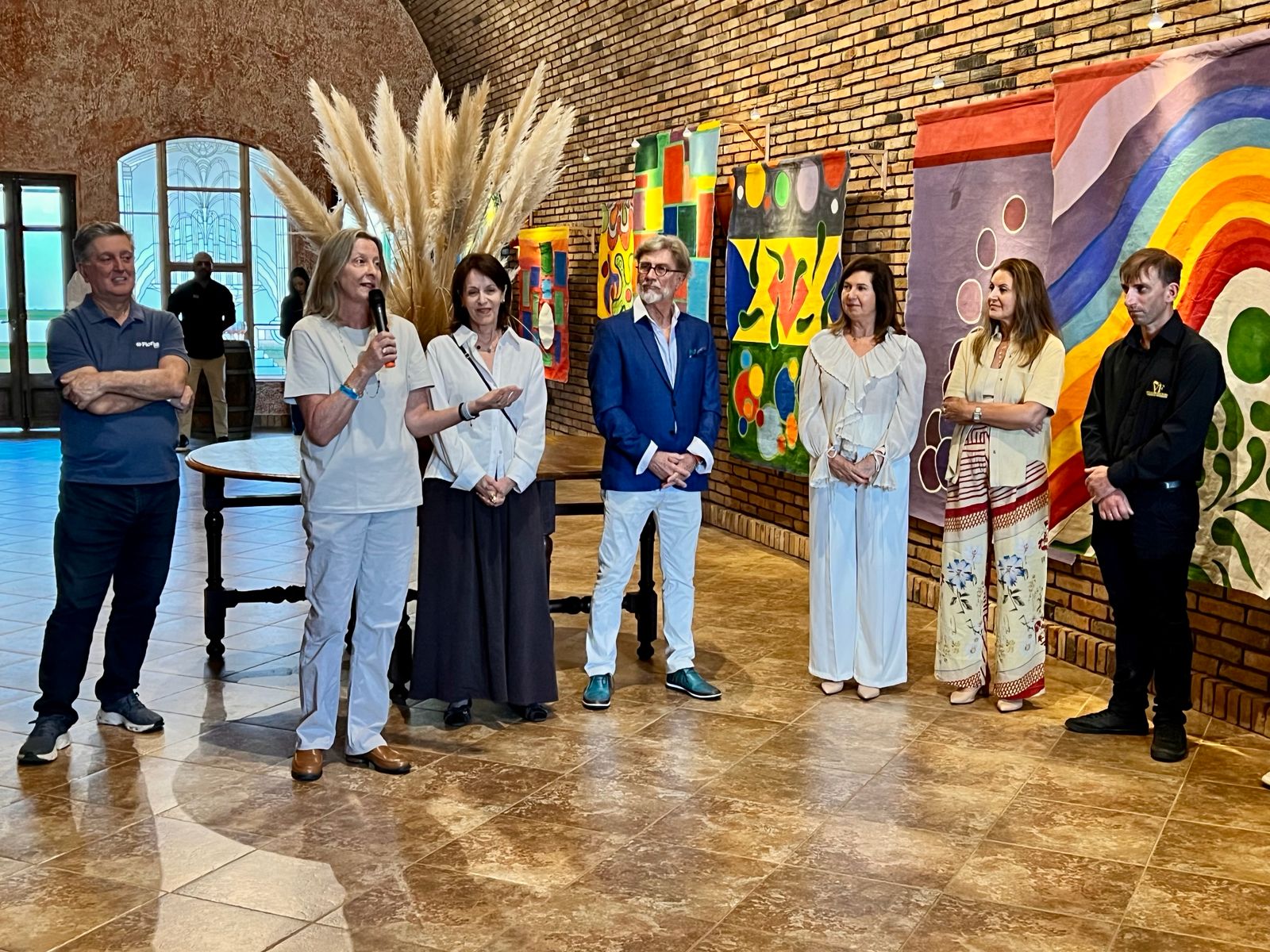 Na abertura da exposição a artista, ladeada pelo marido e prefeito de Florianópolis, Topázio Neto, a curadora Meg Tomio Roussenq, Édson Machado, Daniela e Adriana Freitas, da Vinícola Villa Francioni e o enólogo Nei Rasara, apresenta os conceitos e a história de sua arte. (fotos: HBN/imagemdailha)