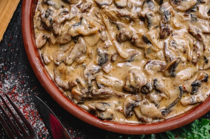 Em uma travessa, coloque o arroz e o molho de cogumelos por cima, finalize com cebolinha e sirva em seguida.