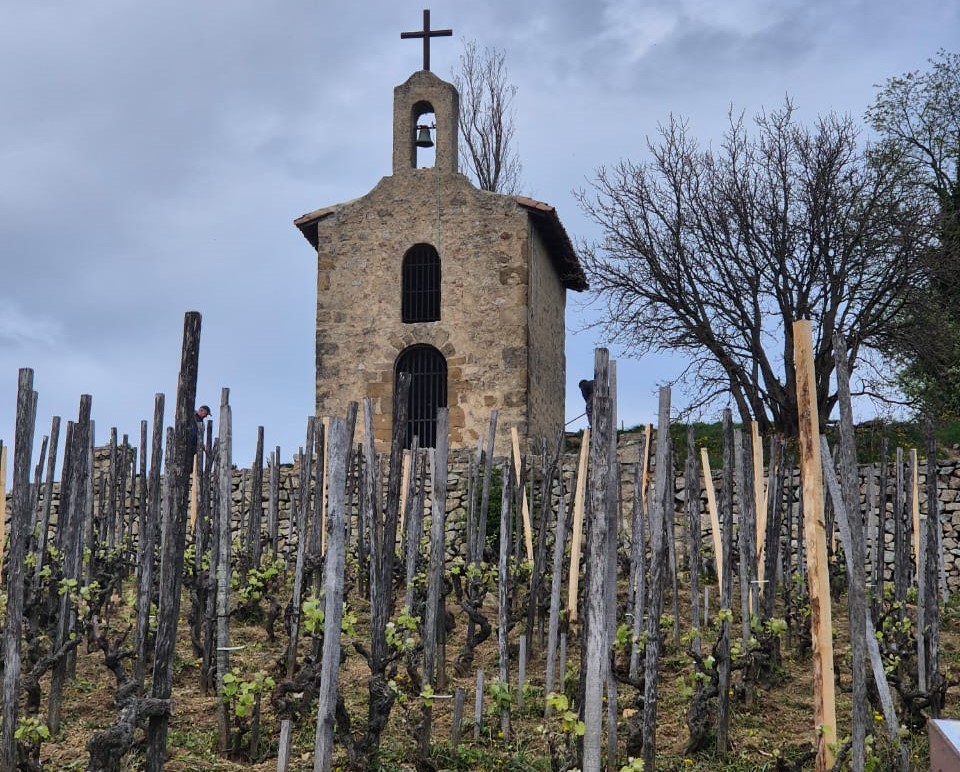 No topo da colina, avistamos a icônica La Chapelle. Há aqui uma curiosidade que confunde muita gente: embora o vinho mais famoso da casa Paul Jaboulet Aîné leve o nome de "La Chapelle", a empresa é proprietária apenas da pequena construção. Os vinhedos de vinhas velhas que a rodeiam pertencem a outra potência local, a Maison Chapoutier. Estive no vinhedo com a presença dos dois vizinhos e o clima não era tão amistoso.