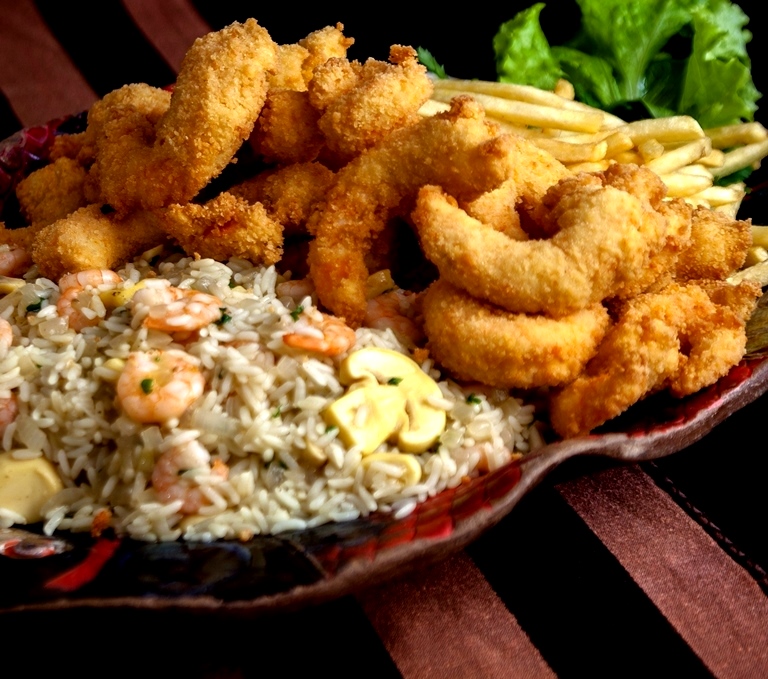 -Camarão do Vô Zeca (camarões empanados na farinha oriental panko, acompanhado de risoto de camarões e champignon na manteiga).