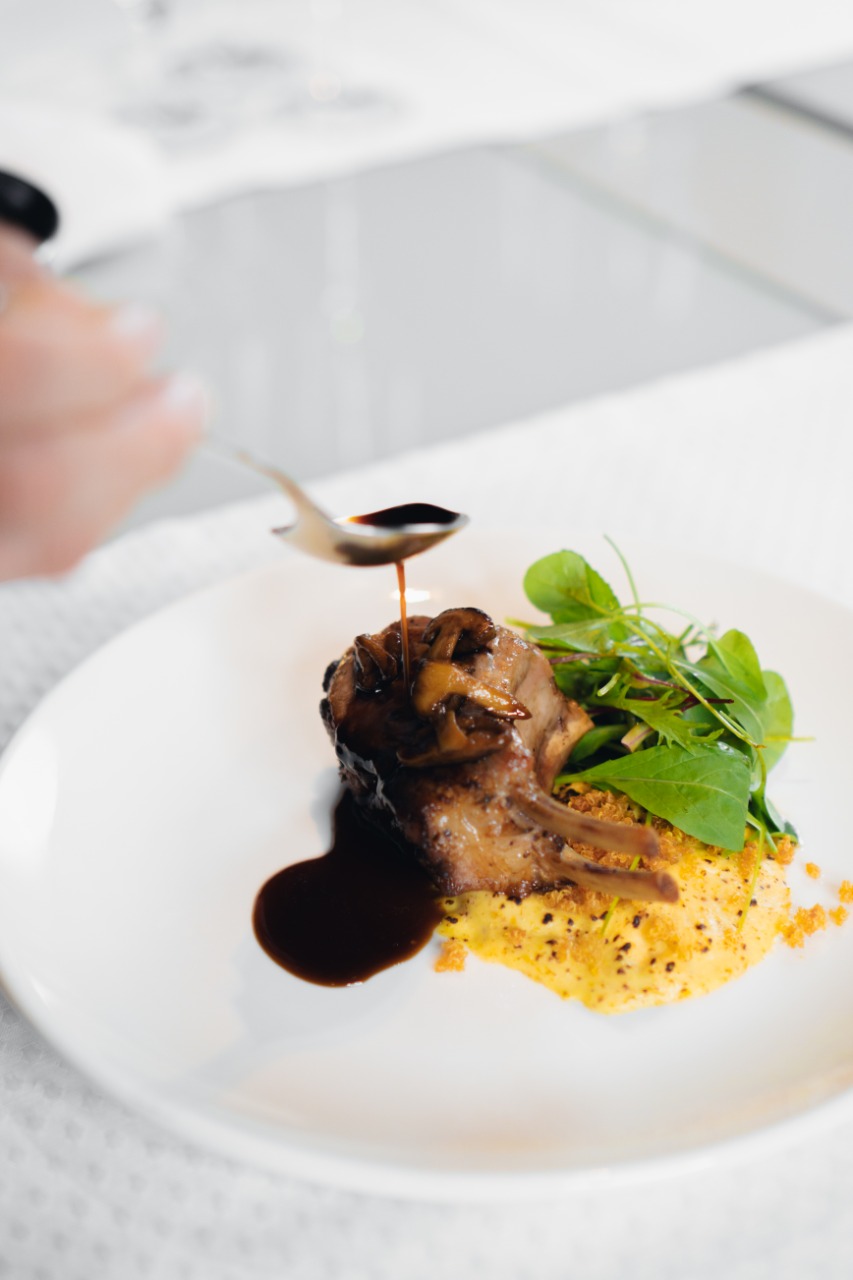 Pratos principais: Peixe fresco grelhado com lardo, água de caqui, bernaise de erva mate, purê de couve flor, favas verdes e farofa de barú | Codorna recheada de porcini e pinhão, cará, cenoura, folha de mostarda fermentada, e espuma de alho negro com consome de jamon de porco mouro | Cupim em baixa temperatura ao glace de caramelo de amora, polenta branca trufada, panc chamuscada envolto em óleo de gergelim