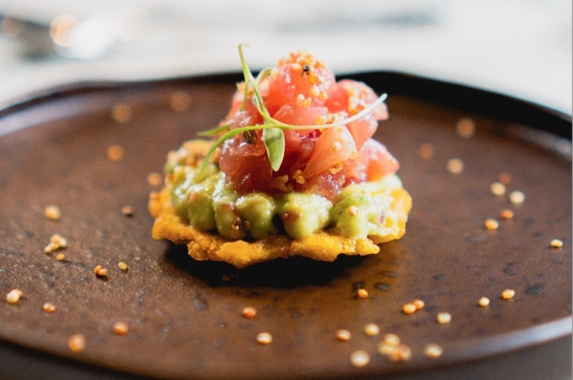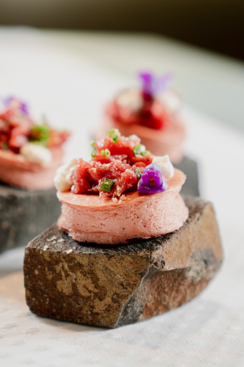 Entradas: Carpaccio cítrico de viera nativa, wakame e creme de coral trufado | Tartelette de filo com steak tartar de wagyu | Crudo de Atum com bresaola de avestruz, shisso crocante, gel de gochujang e coalhada cítrica
